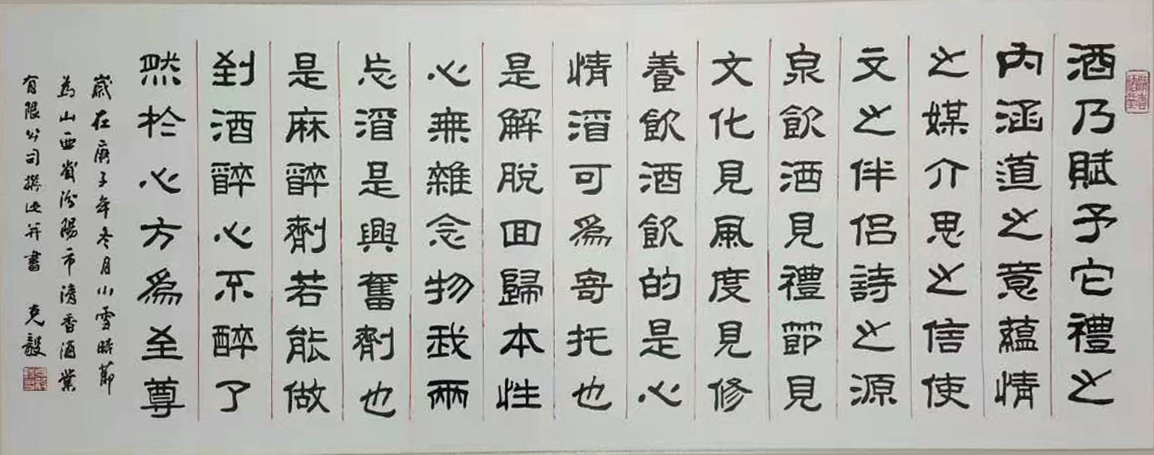 汾陽市清香酒業有限公司座落在中華名酒第一村---杏花村申明亭路9號。《汾酒曲》中記載,申明亭畔新淘井,水重依稀亞蟹黃 ,注解說:申明亭井水絕佳,以之釀酒,斤兩獨重。明末愛國詩人、書法家和醫學家傅山先生,曾為申明亭古井親筆題寫了得造花香四個大字,說明杏花井泉得天獨厚,釀出的美酒如同花香沁人心脾。 汾陽市清香酒業有限公司出品的清香型高端白酒用的是優(yōu)質高粱、大麥和豌豆等上等原料和申明亭地下礦泉水,再加上杏花村土壤和空氣中獨有的菌群,在杏花村釀酒匠人的傳統工藝下精心釀造:清蒸二次清,固態(tài)地缸分離發(fā)酵,清字當頭,一清到底,釀出的酒:酒液晶亮、清香幽雅、醇凈柔和、回甜爽口、飲后余香,在國內外享有盛譽。